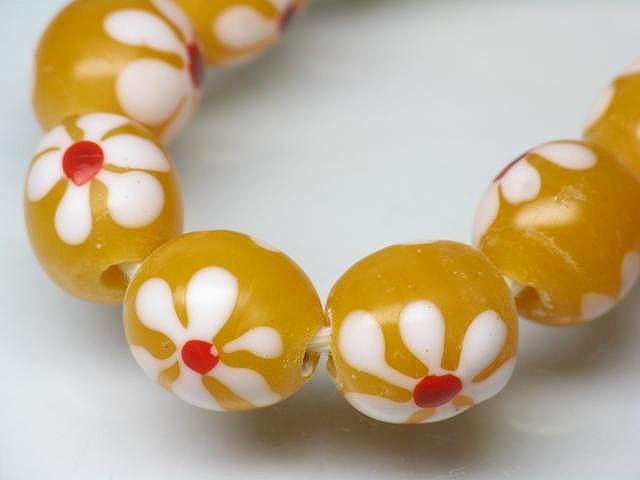 Among the round lampwork bead made at the workshop in Java, Indonesia, there are many with the motif of "flowers". Since it has a long history, there are so many different designs that it seems almost infinite, and it is difficult to reproduce the same color and design. It is no exaggeration to say that I am doing this job now because I was fascinated by these lampwork bead that I saw for the first time in Indonesia decades ago.