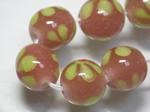 Among the round lampwork bead made at the workshop in Java, Indonesia, there are many with the motif of "flowers". Since it has a long history, there are so many different designs that it seems almost infinite, and it is difficult to reproduce the same color and design. It is no exaggeration to say that I am doing this job now because I was fascinated by these lampwork bead that I saw for the first time in Indonesia decades ago.