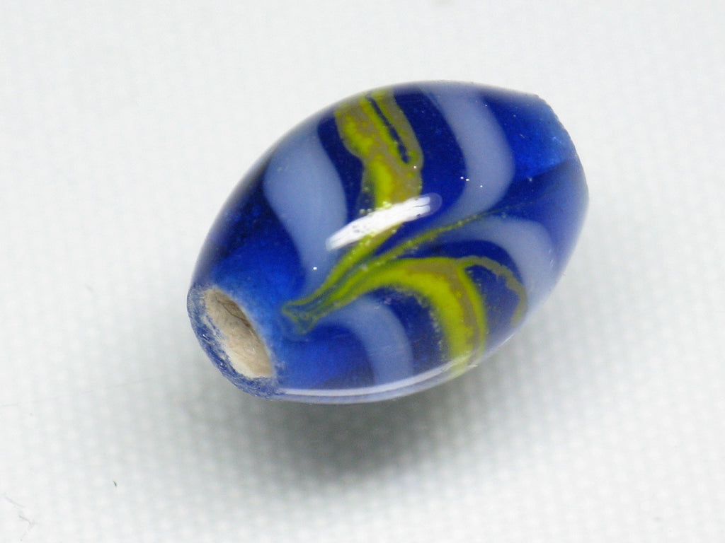 These are lampwork glass beads featuring a feathered-arrow (yabane) pattern. In the final stage of the production process, the horizontal stripes are scratched alternately from top to bottom and bottom to top with a metal rod to create this design.