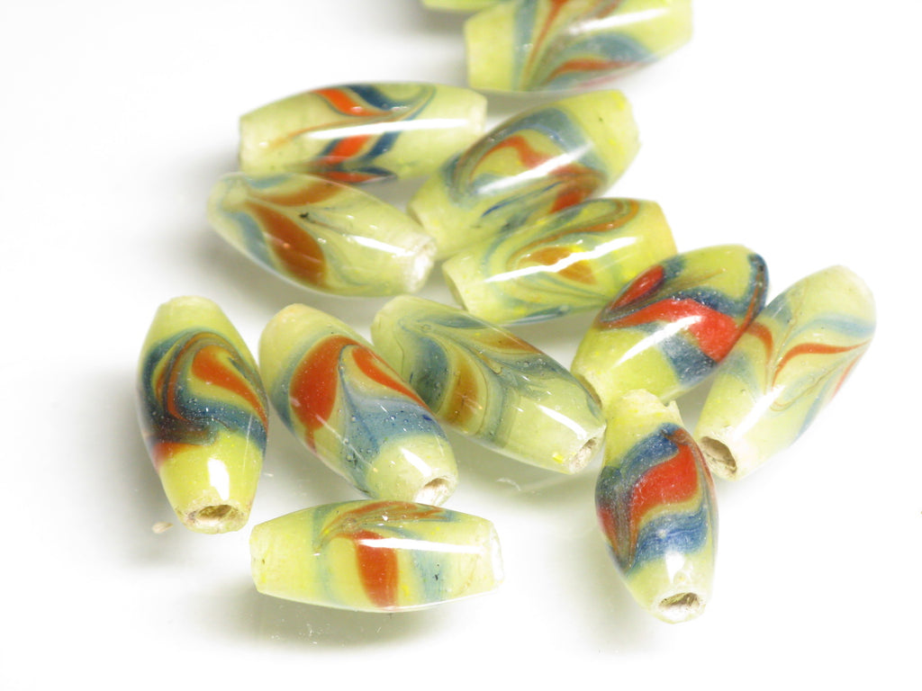 These are lampwork glass beads featuring a feathered-arrow (yabane) pattern. In the final stage of the production process, the horizontal stripes are scratched alternately from top to bottom and bottom to top with a metal rod to create this design.