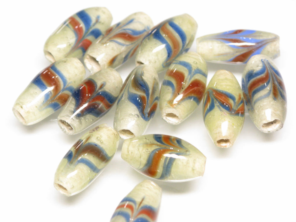 These are lampwork glass beads featuring a feathered-arrow (yabane) pattern. In the final stage of the production process, the horizontal stripes are scratched alternately from top to bottom and bottom to top with a metal rod to create this design.