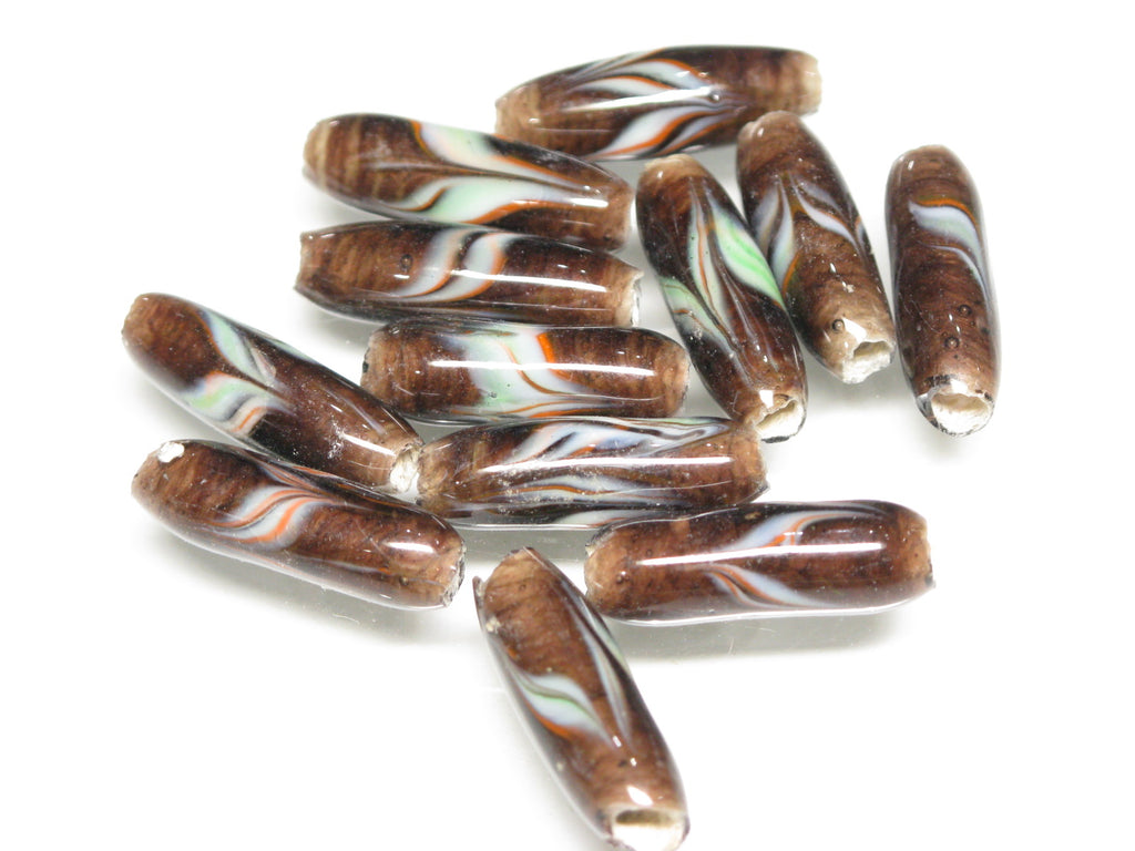 These are lampwork glass beads featuring a feathered-arrow (yabane) pattern. In the final stage of the production process, the horizontal stripes are scratched alternately from top to bottom and bottom to top with a metal rod to create this design.