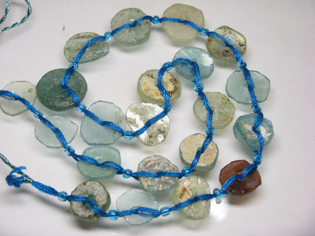 Roman glass bead from Afghanistan made by cutting a thin plate-shaped piece of glass excavated into disc-shape and making a hole in the center. Since Afghanistan was a key point on the Silk Road in Roman era, a large number of fragments of glass products from that time that had been buried in the soil for a long time were excavated.