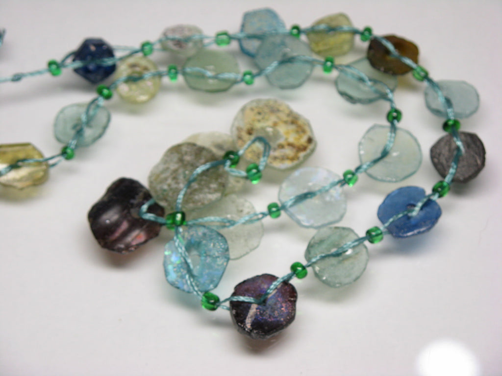 Roman glass bead from Afghanistan made by cutting a thin plate-shaped piece of glass excavated into disc-shape and making a hole in the center. Since Afghanistan was a key point on the Silk Road in Roman era, a large number of fragments of glass products from that time that had been buried in the soil for a long time were excavated.