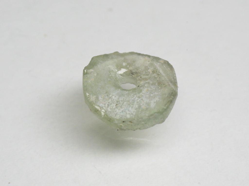 Roman glass bead from Afghanistan made by cutting a thin plate-shaped piece of glass excavated into disc-shape and making a hole in the center. Since Afghanistan was a key point on the Silk Road in Roman era, a large number of fragments of glass products from that time that had been buried in the soil for a long time were excavated.