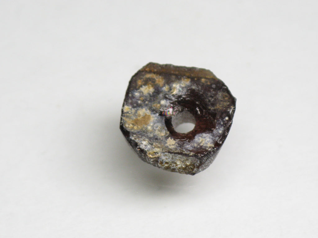 Roman glass bead from Afghanistan made by cutting a thin plate-shaped piece of glass excavated into disc-shape and making a hole in the center. Since Afghanistan was a key point on the Silk Road in Roman era, a large number of fragments of glass products from that time that had been buried in the soil for a long time were excavated.
