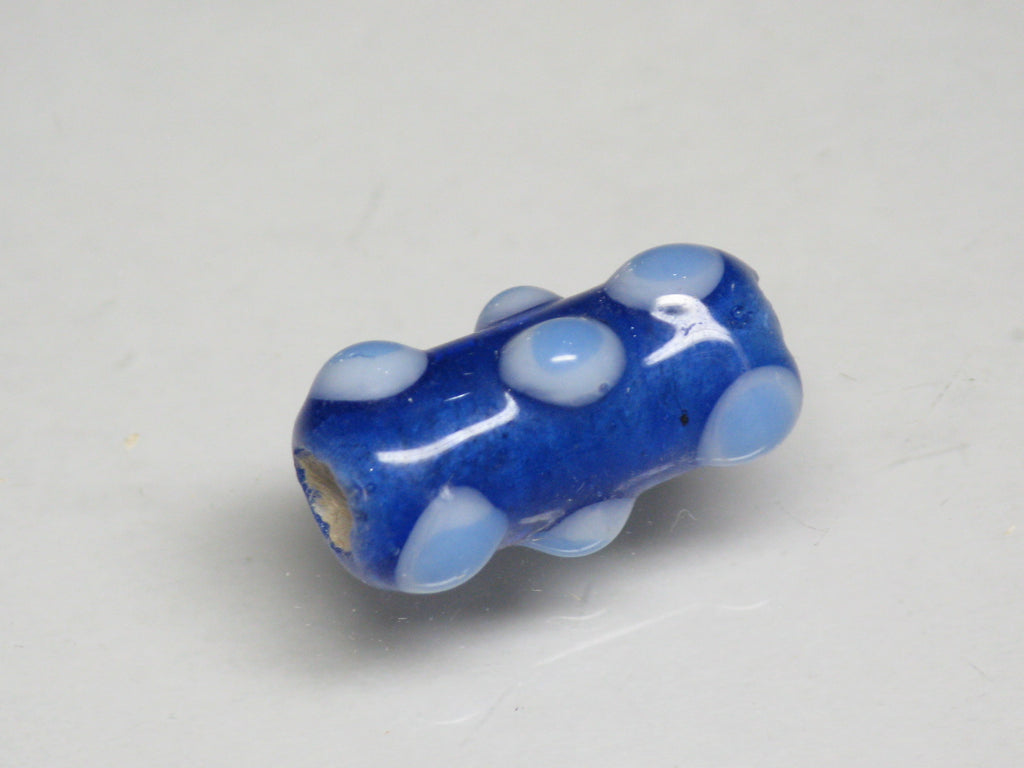 Glass bead with studs (protrusions). In the final process of burner work in a small workshop, colorful glass protrusions are attached to the surface. Since they are all handmade, the size and spacing of the protrusions vary, and some bead have a low height and the protrusions themselves have three colors, giving the bead a handmade feel.