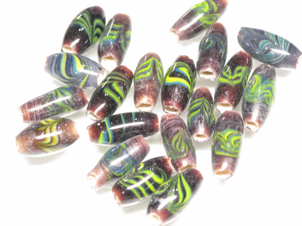 These are lampwork glass beads featuring a feathered-arrow (yabane) pattern. In the final stage of the production process, the horizontal stripes are scratched alternately from top to bottom and bottom to top with a metal rod to create this design.