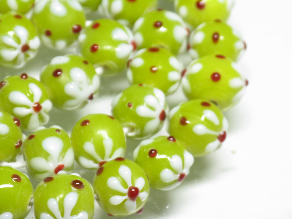 Among the round lampwork bead made at the workshop in Java, Indonesia, there are many with the motif of "flowers". Since it has a long history, there are so many different designs that it seems almost infinite, and it is difficult to reproduce the same color and design. It is no exaggeration to say that I am doing this job now because I was fascinated by these lampwork bead that I saw for the first time in Indonesia decades ago.