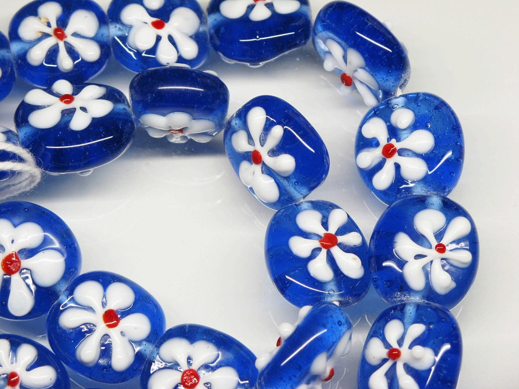 インドネシア・ジャワの工房で作られた丸形とんぼ玉のうち、「花」をモチーフとしたものは数多くあります。歴史が長いタイプのためほとんど無限と思われるほどさまざまなデザインがあり、また、そのことで同色同デザインの再現が難しいタイプです。数十年前にインドネシアで初めて見たこれらのとんぼ玉に魅せられて今この仕事をしているといっても過言ではありません。トコ・ビーズの最も古い商品の一つです。(この商品は手作りジュエリー・アクセサリーパーツ・エスニック雑貨として販売しています)
