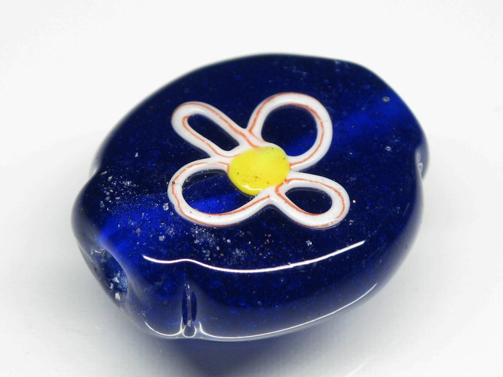 インドネシア・ジャワの工房で作られた丸形とんぼ玉のうち、「花」をモチーフとしたものは数多くあります。歴史が長いタイプのためほとんど無限と思われるほどさまざまなデザインがあり、また、そのことで同色同デザインの再現が難しいタイプです。数十年前にインドネシアで初めて見たこれらのとんぼ玉に魅せられて今この仕事をしているといっても過言ではありません。トコ・ビーズの最も古い商品の一つです。(この商品は手作りジュエリー・アクセサリーパーツ・エスニック雑貨として販売しています)